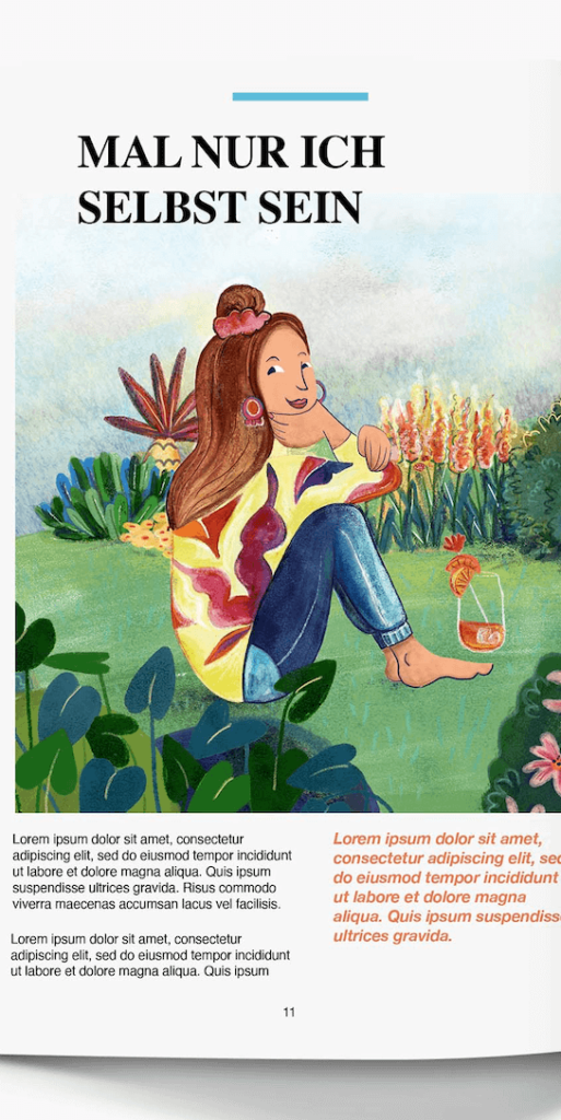 My passion is analog illustration with watercolor. Working with my hands, with a brush, paint and paper inspires me again and again and lets my imagination grow to infinity. My irrepressible curiosity keeps me experimenting with new techniques and technologies. I have professionalized and integrated the following styles into my creative everyday life: